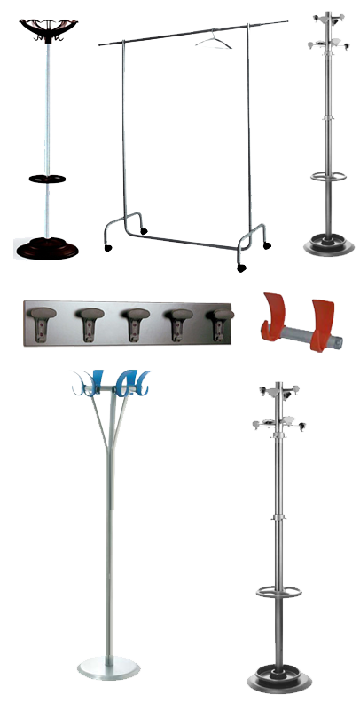 Appendiabiti a colonna provvisti di anello portaombrelli, Appendiabiti a muro dotati di cinque pomoli in materiale plastico, Carrelli appendiabiti realizzati con telaio in acciaio cromato e su ruote in materiale plastico,